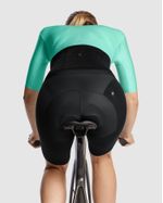 Las mangas se refuerzan con una construcción dual, que también crea un corte más aerodinámico y mantiene un elegante diseño de líneas depuradas en todo el maillot.